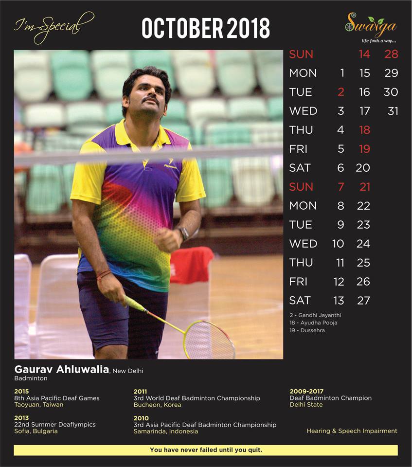 “I’m Special – 2018” is the third edition of the calendar that was successfully launched in 2017. The 2018 edition showcasing 12 proficient sportspersons across India who have won accolades at both national and international events, with the theme being, “ADAPTIVE SPORTS” (6 male and 6 female affected with neurological diseases) hailing from various parts of India who have achieved significantly irrespective of their complex disabilities. Two versions of the calendar: wall hanging and desktop versions were released. Both versions of the calendar have been designed to incorporate corporate logos as required. The Calendar was conceptualized and designed in-house by the differently-abled. A video featuring all these models was also launched for online media promotion. All proceeds from the sales of the calendars will be used for ongoing projects. The purpose of the Calendar is to generate respect for people with Special needs.